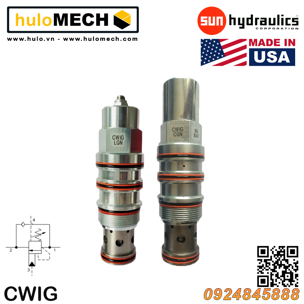 van cân bằng áp suất cartridge SUN Hydraulics CWIG là van cân bằng tải (counterbalance) dạng cartridge, có cấu trúc vented và hỗ trợ pilot assist.